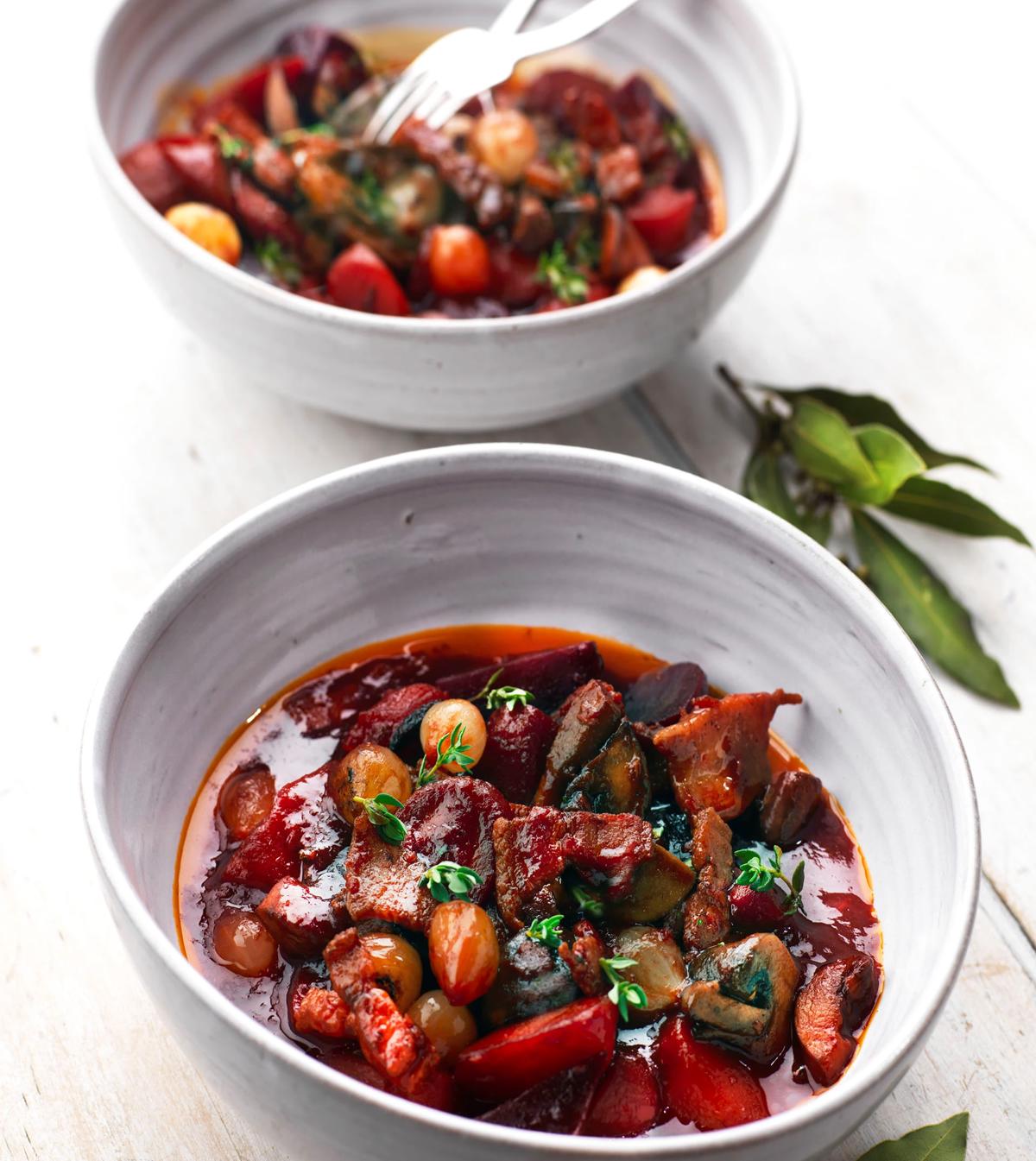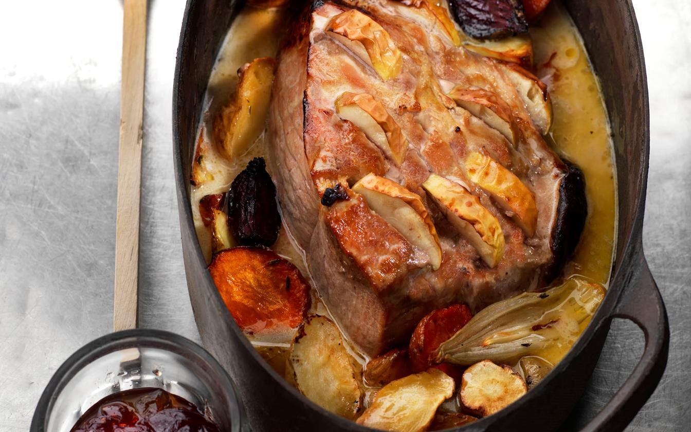 Servera steken tillsammans med cidersås, ugnsrostade rotfrukter, gelé och grönsaker. Toppa med finhackade örter.