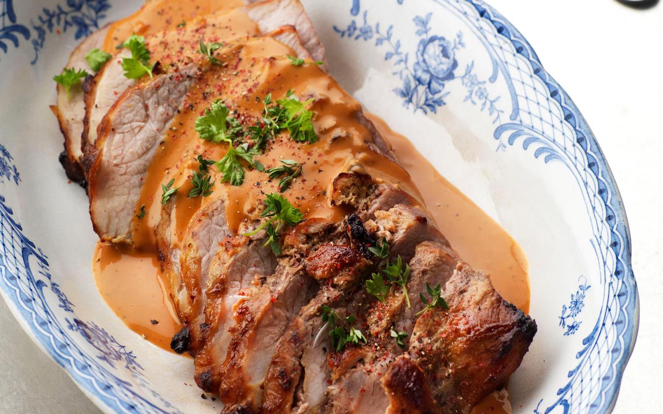 Stek skinksteken i ugn, 1 timme 40 minuter på 140 grader. Höj därefter temperaturen till 160 grader och stek vidare till kärntemperaturen 65 grader. Låt därefter köttet vila minst 10 minuter innan tranchering.