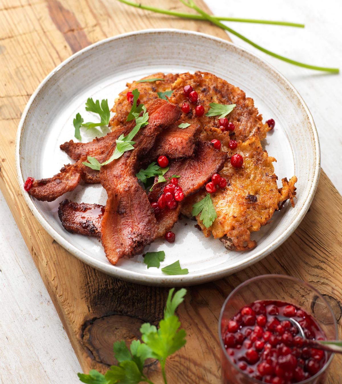 Stek fläsket knaprigt och lägg det på bleck för varmhållning. Börja med lite olja på stekbordet så blir fläsket knaprigare. Det går också bra att steka fläsket på ”stekbleck” i ugnen.